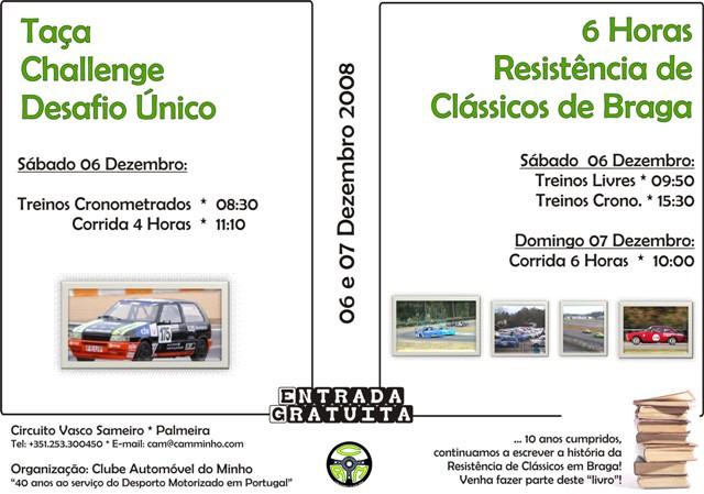 Em termos de esquema desta prova, no sábado, 6 de Dezembro, a Taça Challenge Desafio Único tem os seus treinos cronometrados a partir das 8h30, tendo depois a sua corrida a partir das 11h10. Ainda no sábado, os concorrentes das 6 Horas de Resistência de Clássicos de Braga tem uma sessão de treinos livres às 9h50 e os cronometrados às 15h30.